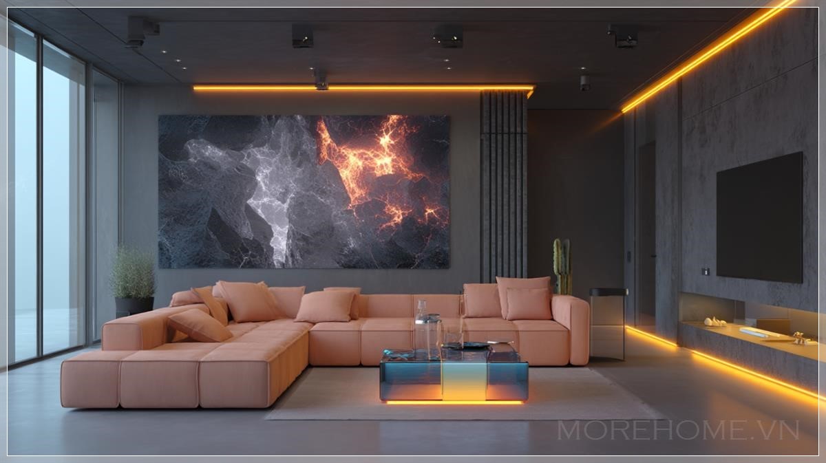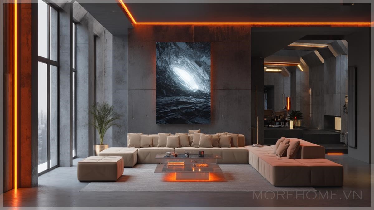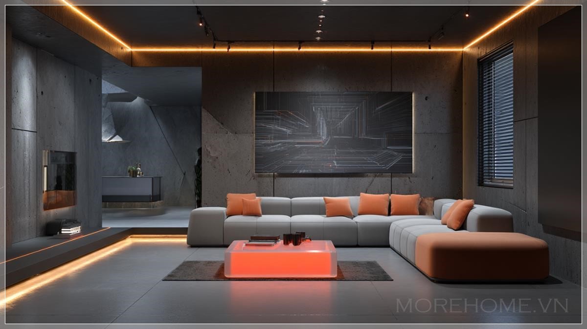 Tưởng tượng bạn bước vào một căn phòng nơi ranh giới giữa khoa học viễn tưởng và thực tế dần tan biến. Những bức tường xám mờ ảo như ôm trọn không gian, điểm xuyết bằng những dải đèn LED tích hợp tinh tế tỏa ánh sáng hổ phách ấm áp, tạo nên một bầu không khí vừa thanh bình vừa đầy công nghệ.