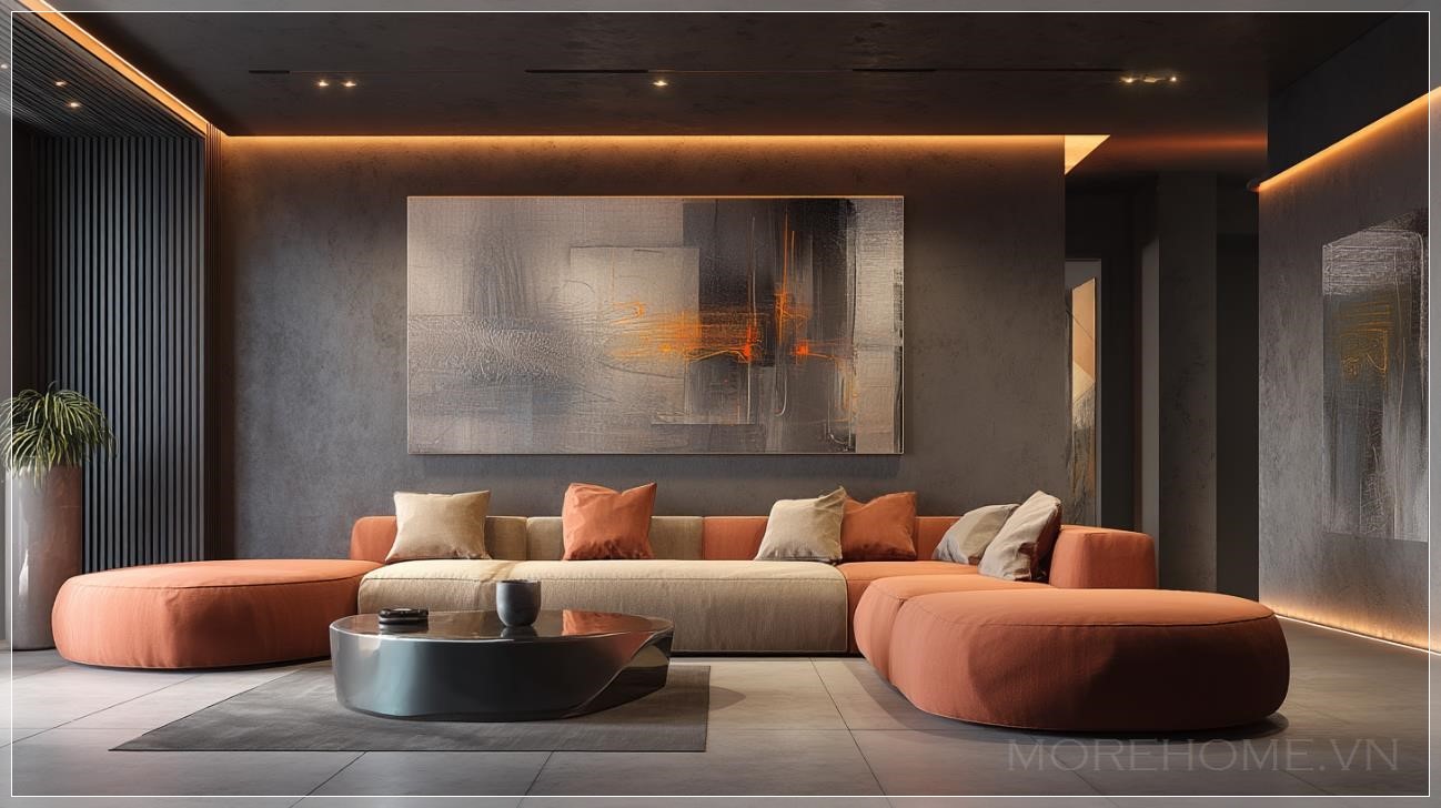 Bộ sofa mô-đun với tông màu terracotta nhạt nằm ở trung tâm phòng khách như một tuyên ngôn của sự thoải mái hiện đại. Những đường nét mềm mại của nó tạo ra sự đối lập tinh tế với các yếu tố hình học sắc nét khác trong không gian. Cấu trúc mô-đun thông minh cho phép biến đổi linh hoạt theo nhu cầu sử dụng - khi cần không gian rộng rãi cho những buổi họp mặt gia đình, hay chỉ đơn giản là một góc đọc sách yên tĩnh sau ngày dài.